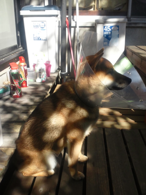 エリザベスカラーに、こもれ日を浴びながら、ボーっとしてました。