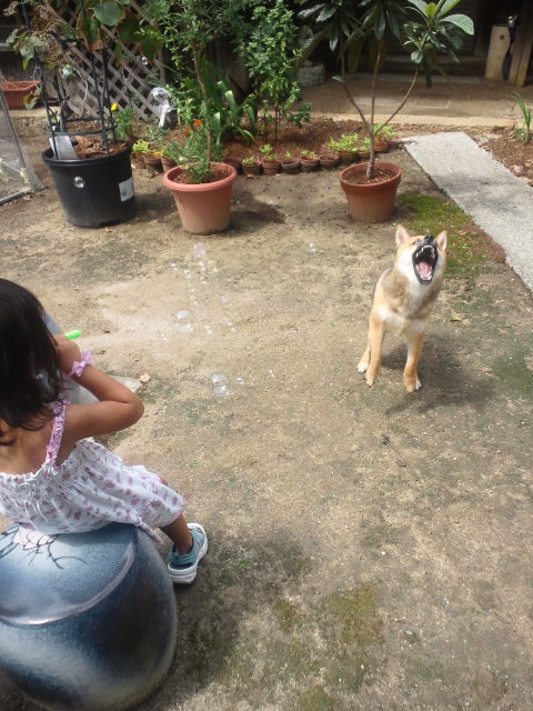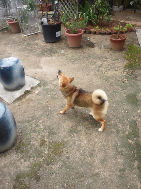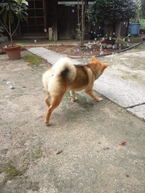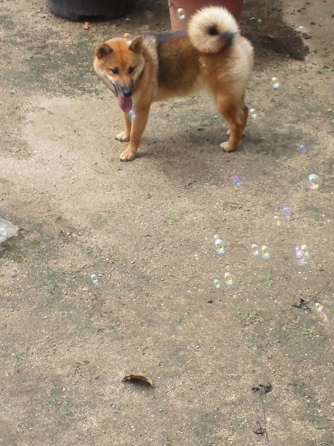 柴犬にとっては、シャボン玉がボールに見えるのでしょうね。