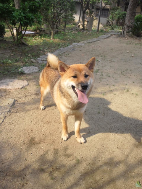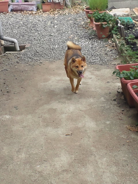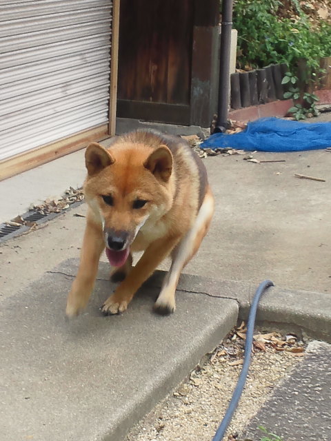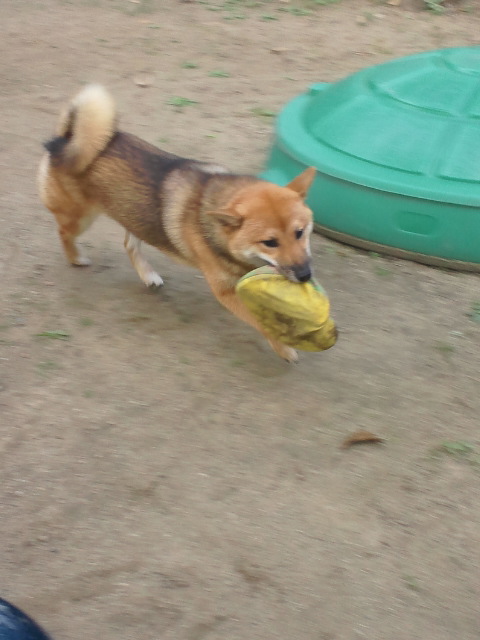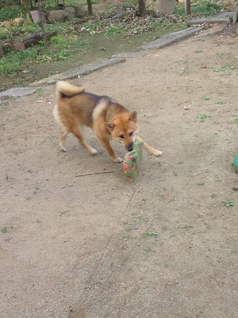 息子が近づいて行くとくわえて逃げる柴犬さくら。