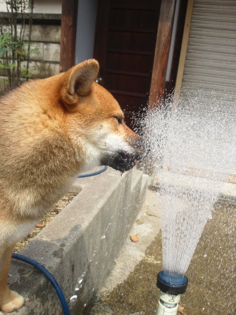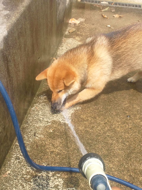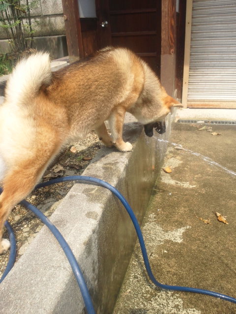 壁に当てると乗り出してホースの水に近づく柴犬さくら。