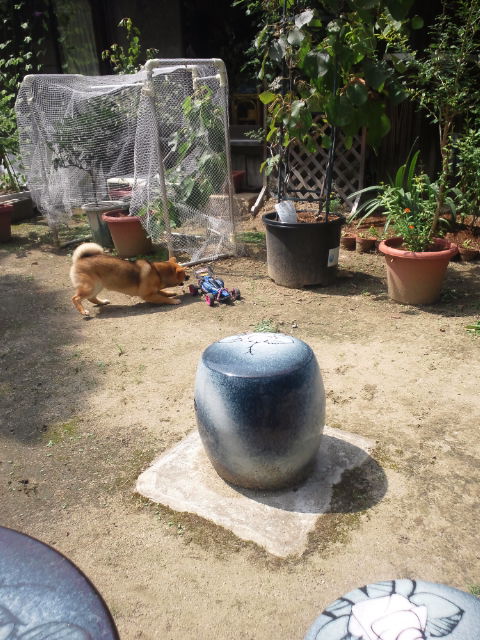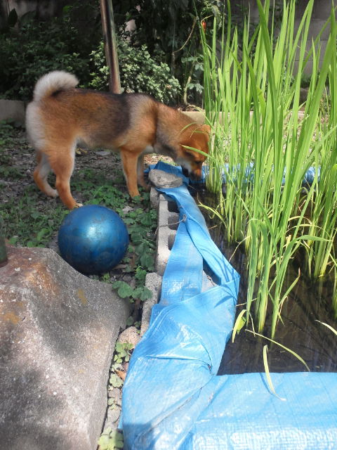 喉が渇いたのか、ラジコンを見捨ててお気に入りの青いボールをくわえてどこかに行きます。