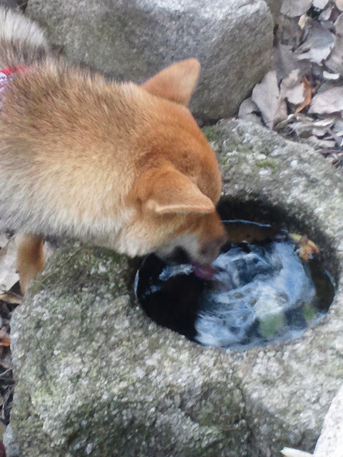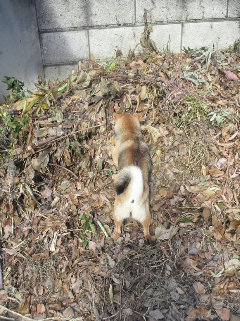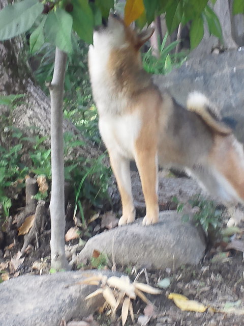 落ちている木の実を見て(カミカミして)、まだあるかな?と木に顔を突っ込む柴犬さくら。