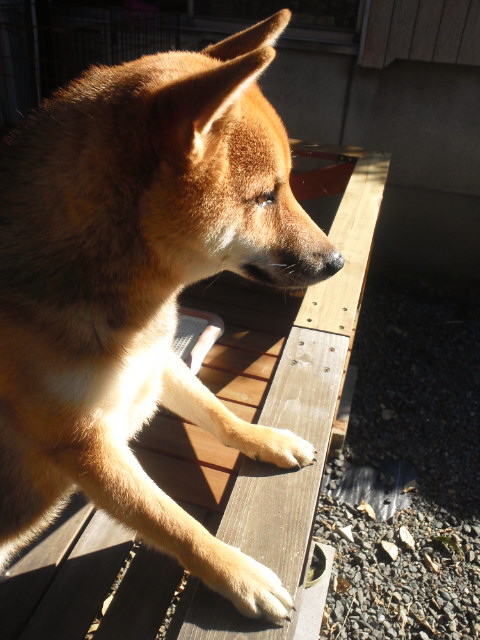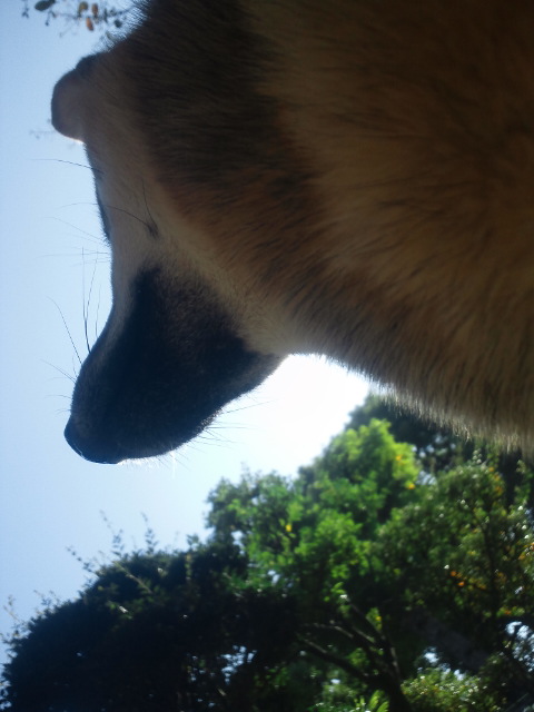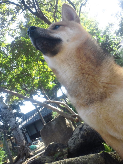 上からだけでなく、下からも様子をうかがう柴犬さくら。