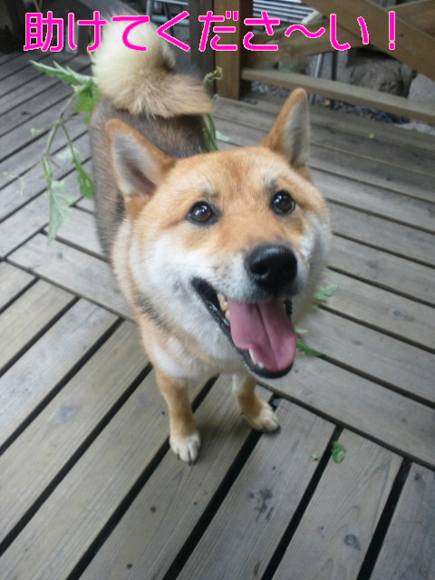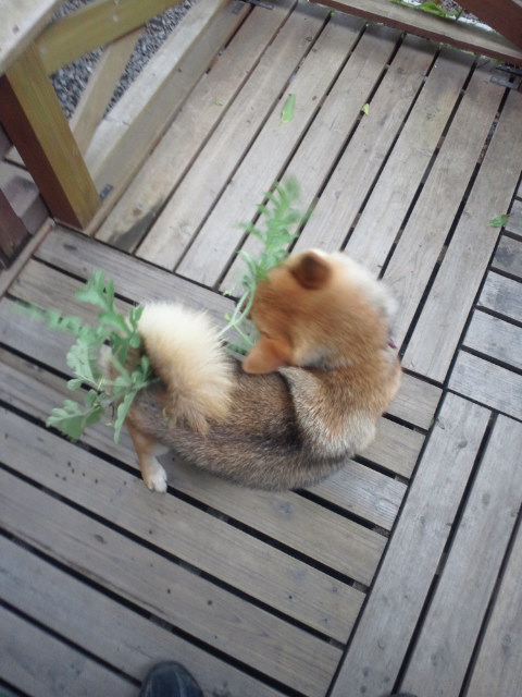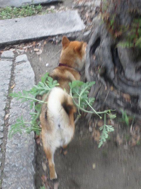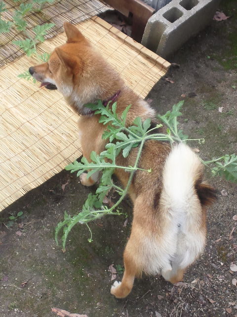 歩いてる間に、自慢のクルリンしっぽにはまってしまったスイカの蔓(^_^;)
