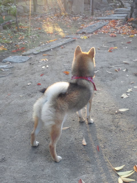 西日のおかげで黄金に輝いてみえる柴犬さくらに