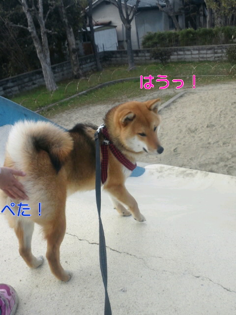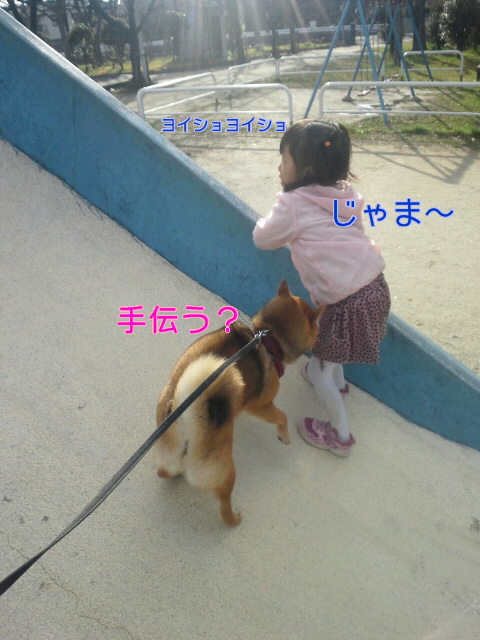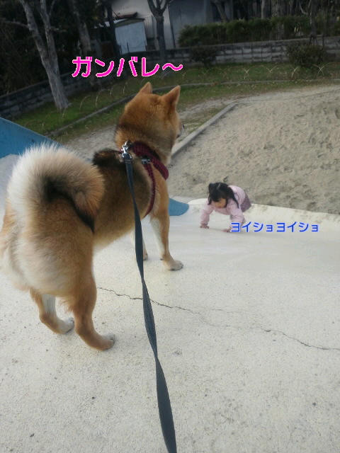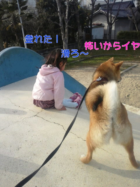 娘に滑り台に誘われるも、ビビり全開の柴犬さくらf^_^;