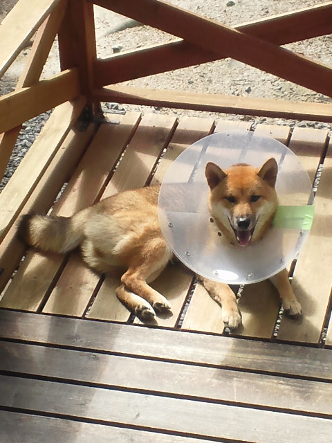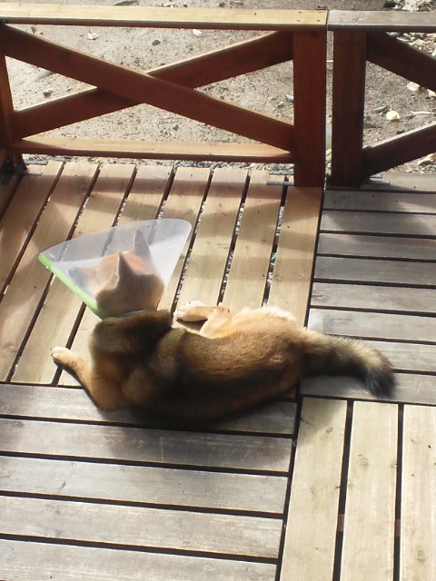 エリザベスカラーにも慣れてきたのか、どうしたら楽か判ってきたみたい。