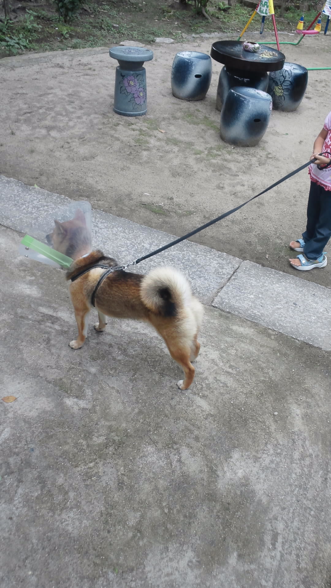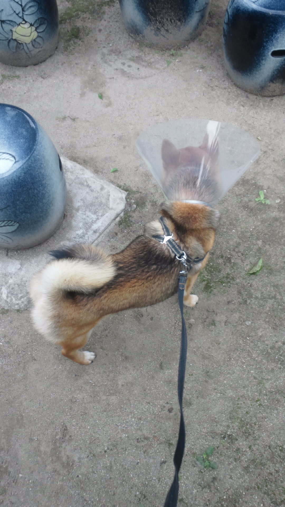 いつもは平気な段差もエリザベスカラーがあたり、匂い嗅ぐのもエリザベスカラーが邪魔な柴犬さくらf^_^;