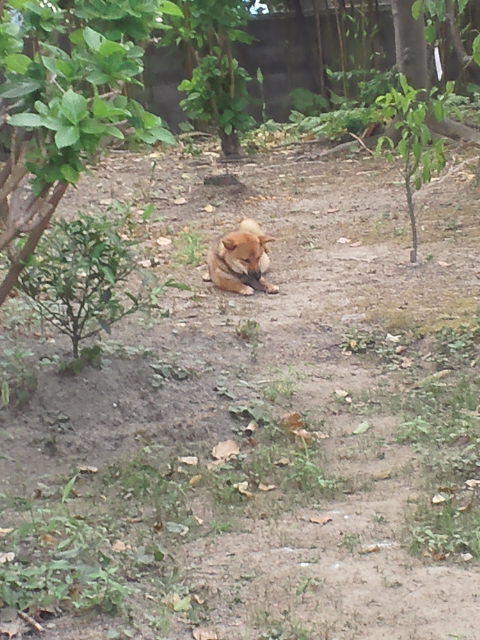 庭で走りまわって、何を見つけたのか片隅でイタズラ中のさくら。
