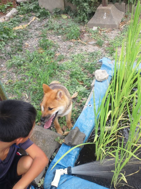 ブルーシート水田の横でくつろぐ柴犬さくら