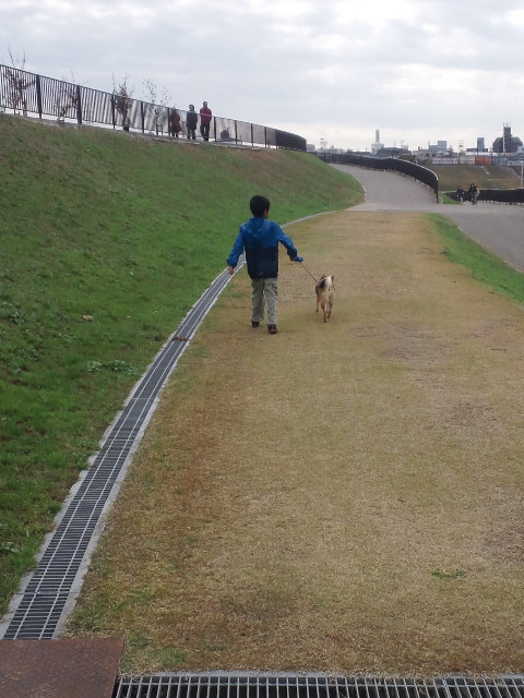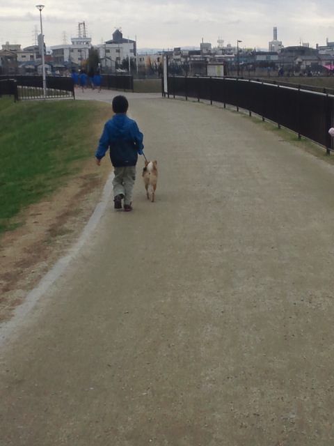 一人でさくらの散歩行けるように練習中の息子と、それに付き合ってる柴犬さくらに