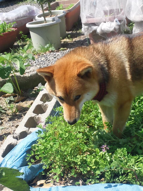 隅々まで、花を探す柴犬さくら。