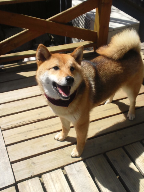 何も無かったかのように、ウッドデッキでにこやかな柴犬さくら…