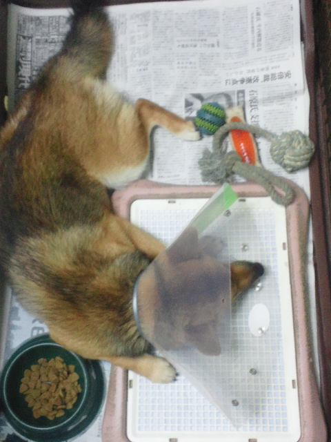 首には、患部を舐めないように、「エリザベスカラー」なるプラスチック製の物を付けられてます。