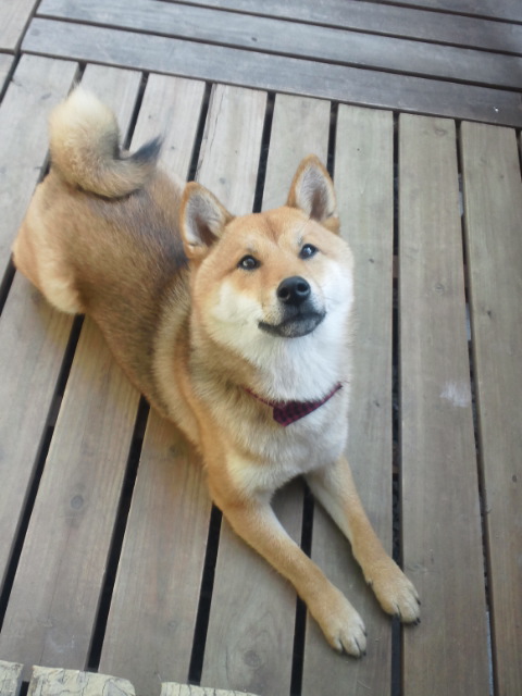 ササミジャーキーをもらおうと、お利口にフセしてクレクレ光線発射!