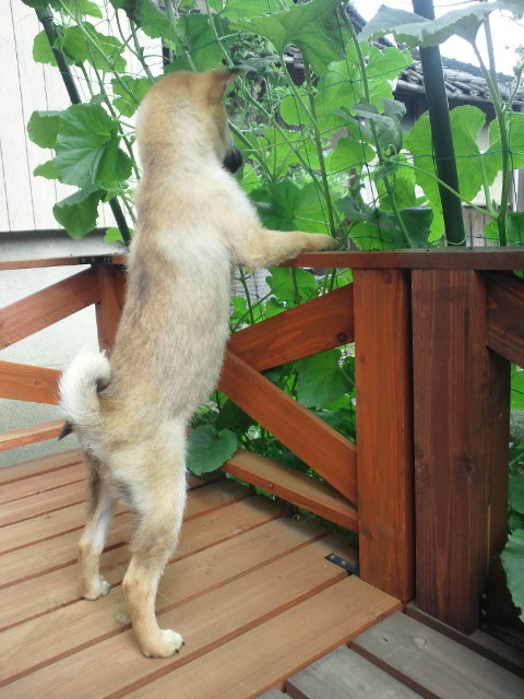 ドンドン成長するグリーンカーテンに少し戸惑っている様子。