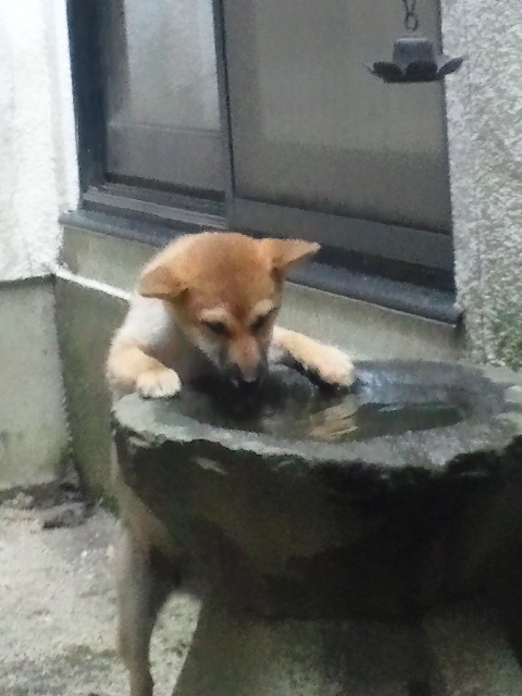 中庭で、水飲みに夢中の柴犬さくら。