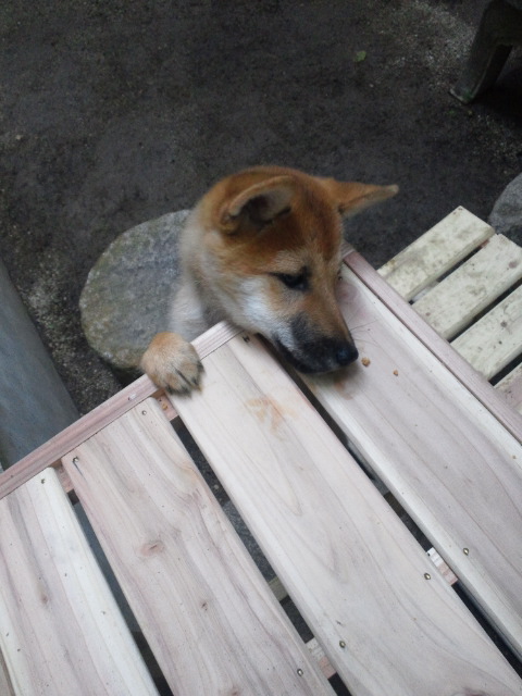 ブラシのためにウッドデッキへ出た柴犬さくら。