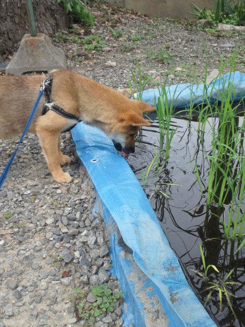 走り回って喉が渇いたのでしょうか、ブルーシートの田んぼの水をごくごく!