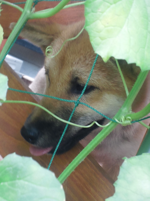 マクワのグリーンカーテンの下葉が枯れてるのがあるので、取り除いていると…