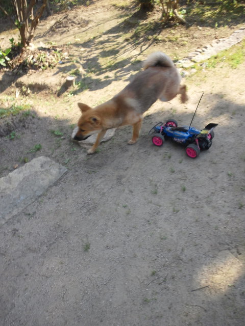 息子がラジコンを走らせると、追いかけるのに夢中の柴犬さくらf^_^;