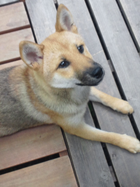 疲れてブラッシングの後、ウッドデッキでへたるさくら。