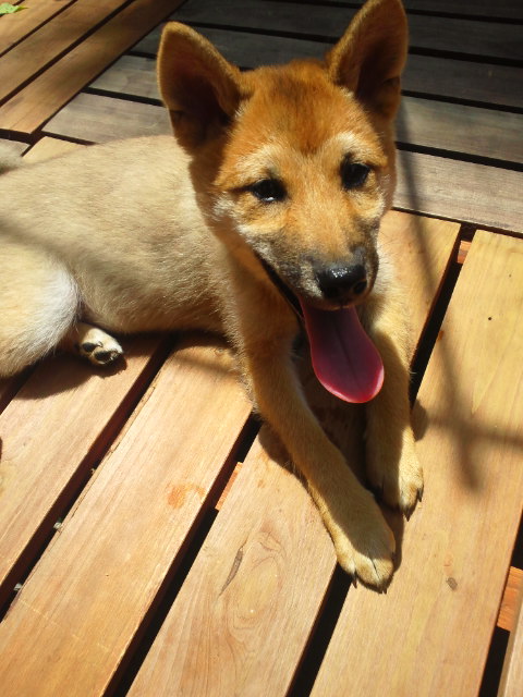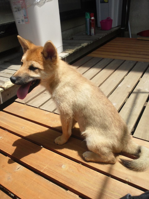 ウッドデッキでは、ブラッシングの後、暑いのかしばらくペタン