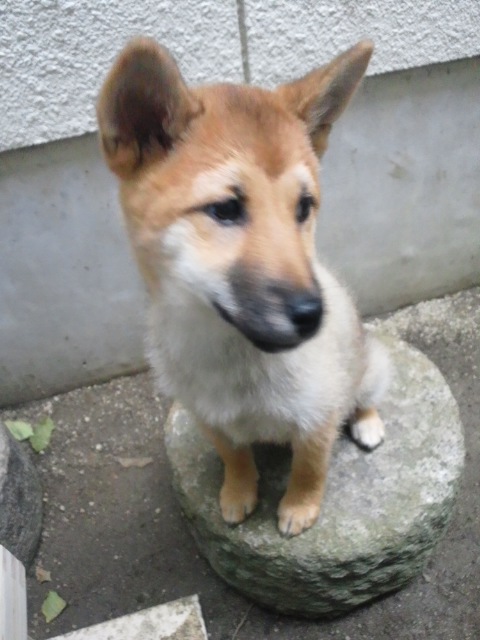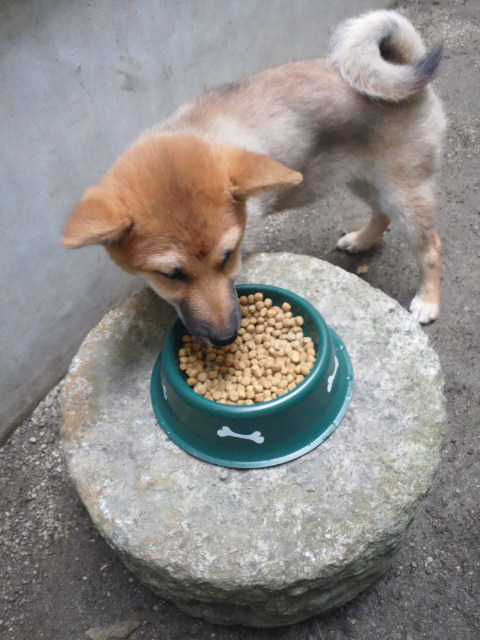 中庭で食事中の柴犬さくら!