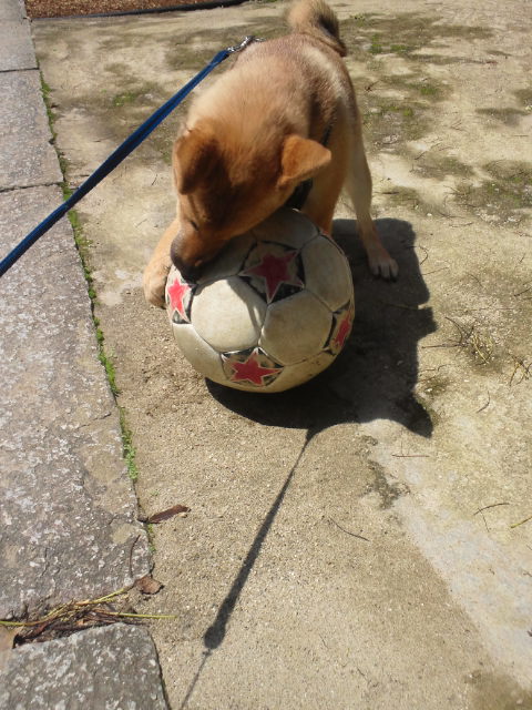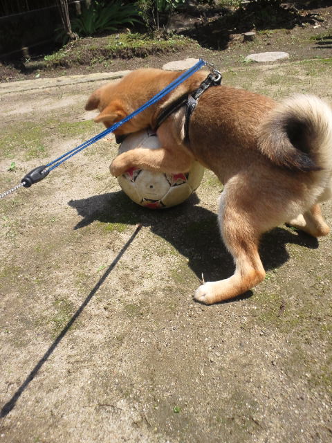 なかなか思い通りにならないのか、必死にボールと格闘する柴犬さくら!