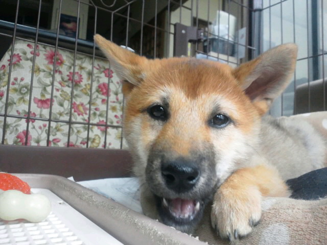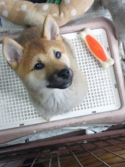 静かにしてるので、おやつの骨ガムを上げると静かにカリカリやってました。