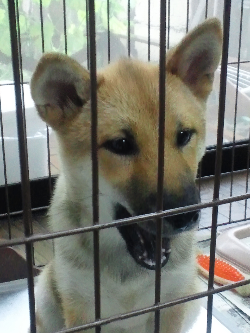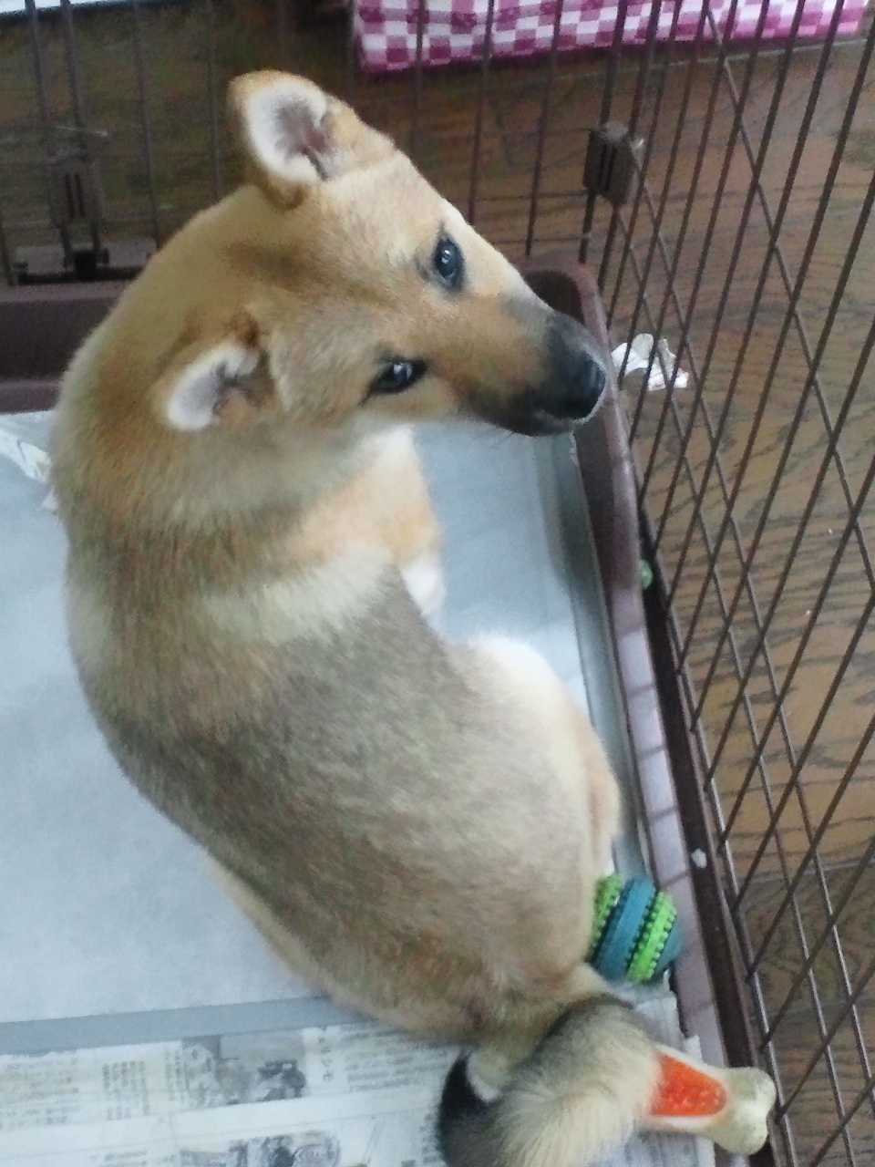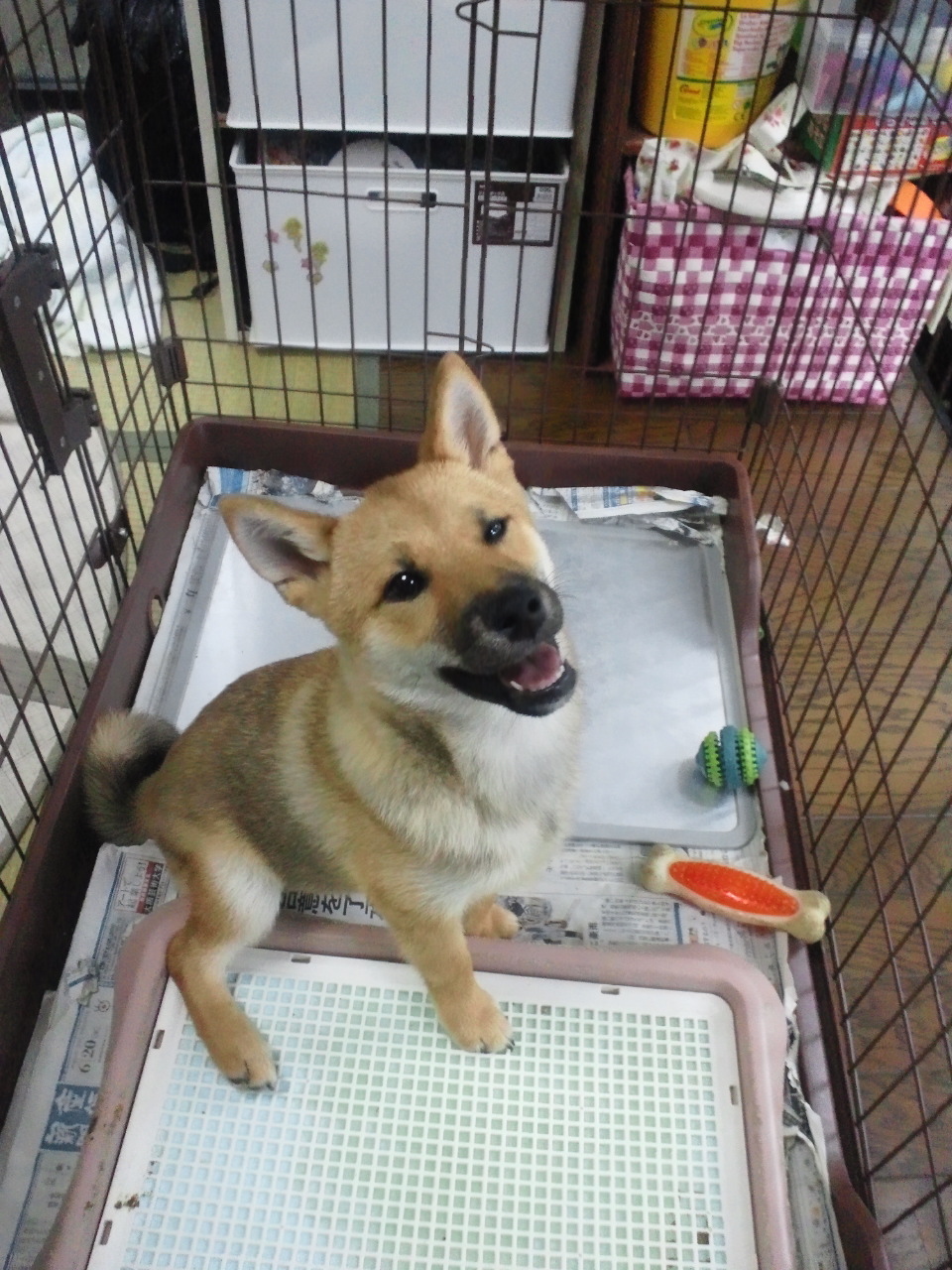 って顔してお利口に座ってキッチンを見つめる柴犬さくら。