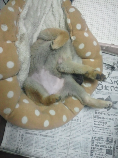 お腹を上にして、反り返りながら頭を変な所に置いて眠ってます。
