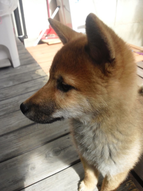最近、ウッドデッキの手すりからよく顔を出して下を眺めてる柴犬さくら。