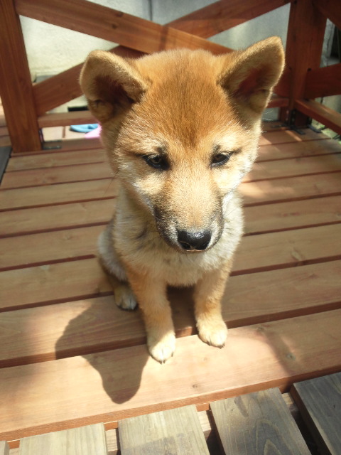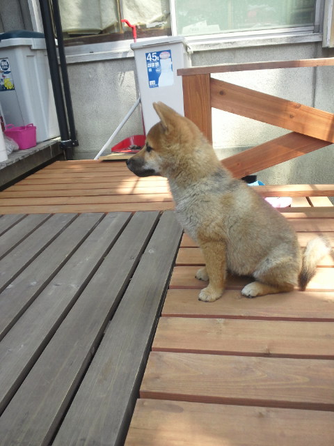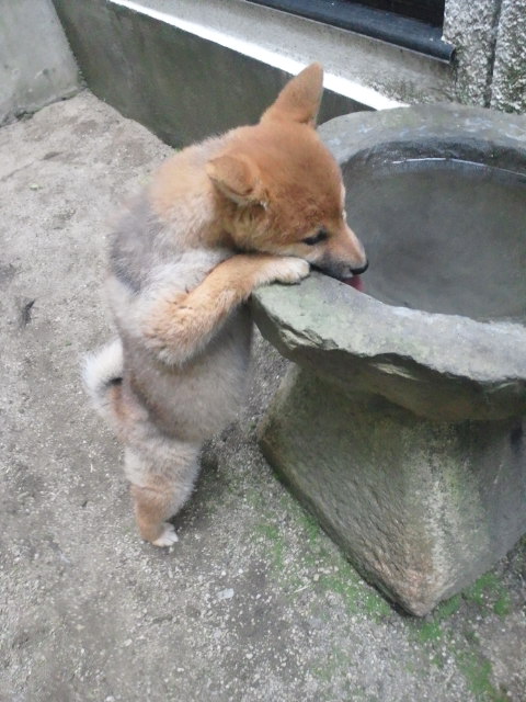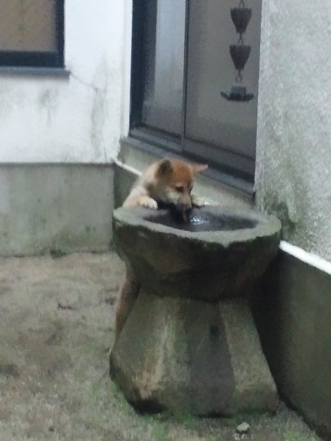 走り回って喉が渇いたのか、中庭にある雨受けの水を飲む柴犬さくら!