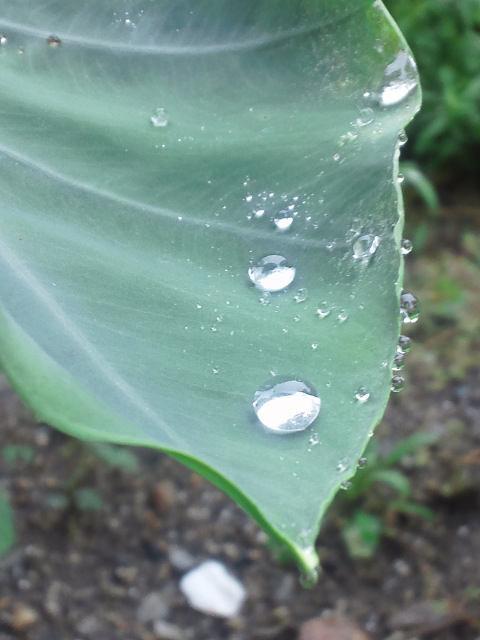 先日の雨の狭間、サトイモの葉っぱの上に水滴。