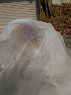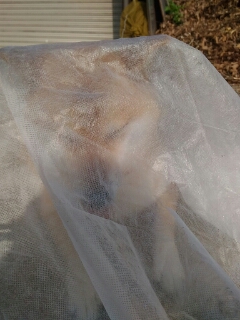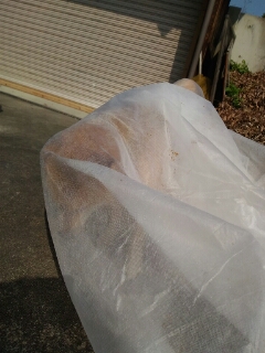 不織布に紛れ込んでいたバッタに、気がついたようです。