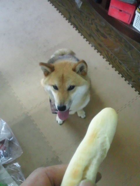前日焼いたレーズンパンを貰えると期待していた柴犬さんに、ママが焼いてくれたのです。