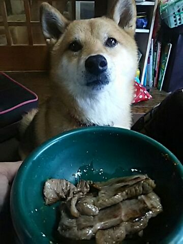 犬生初の猪肉ステーキでに大興奮の柴犬さくら。