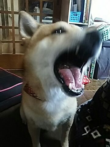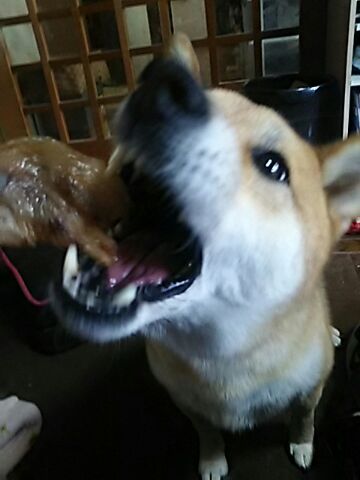 お口の開け方からして、満足されたんでしょうか? 未だもうチョット食べたかったと思いますが、さくらさんだけの猪肉ではないので我慢してくださいネ。