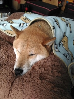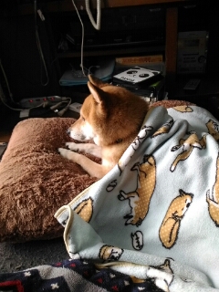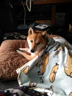 番犬していた柴犬さくらに、毛布をかけてあげました。