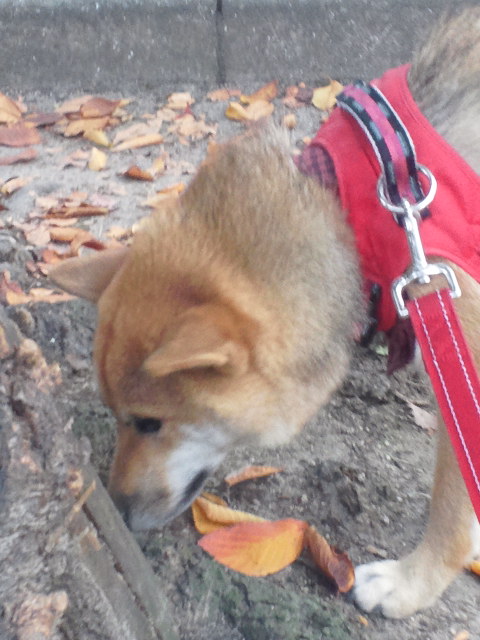 柴犬さくらは、紅葉し始めた木の健康チェック。