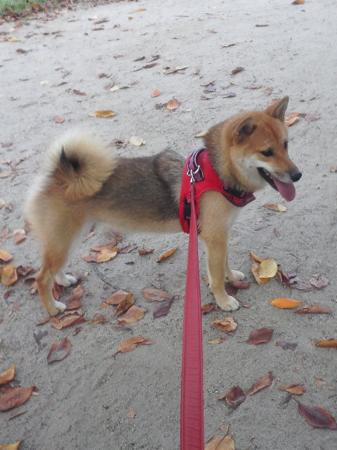 落ち葉絨毯を楽しみにしている柴犬さくらに