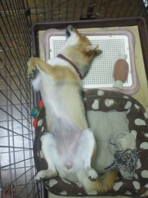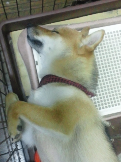 秋の夜長に、のびのびと寝ている柴犬さくらに