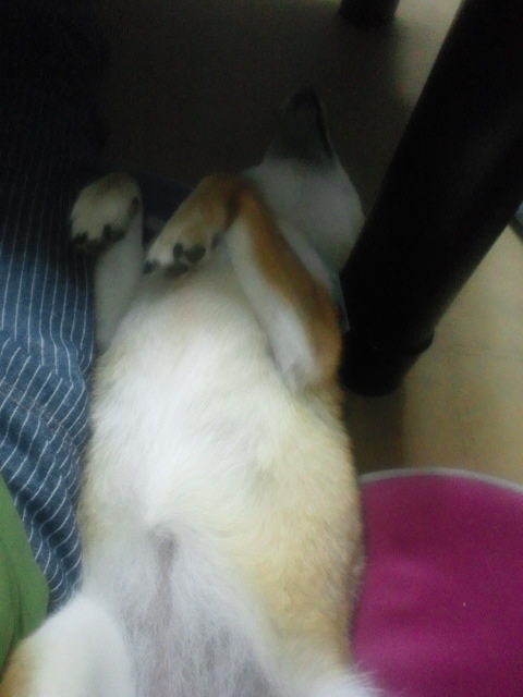 人の横の微妙な隙間で、こんなポーズの柴犬さくら。