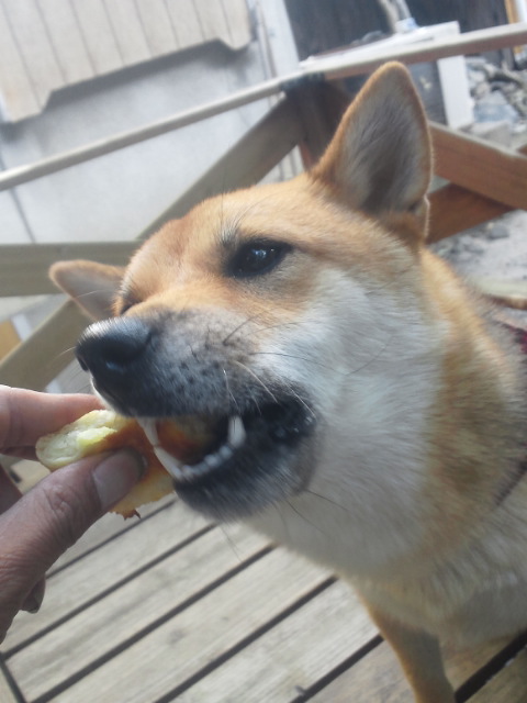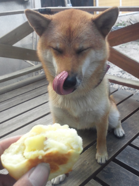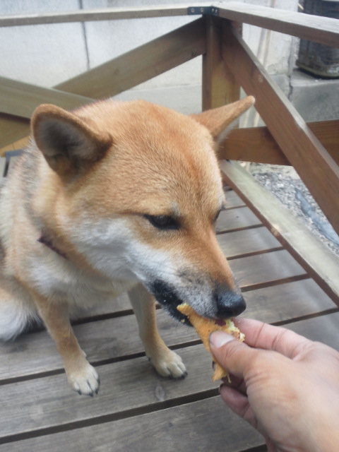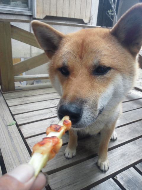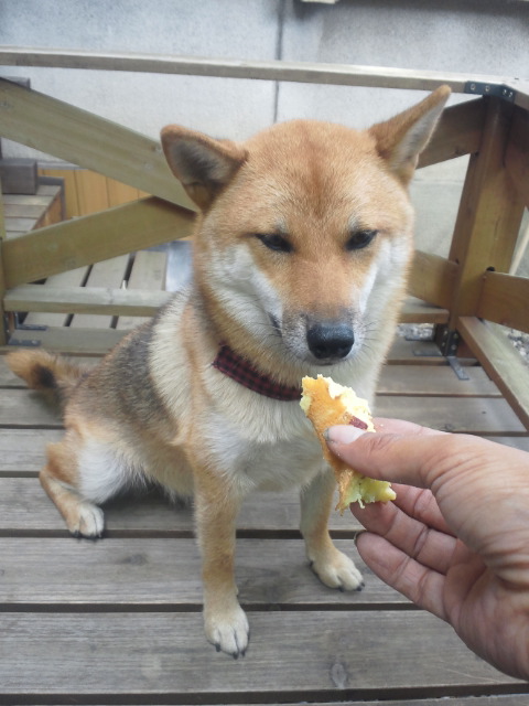 焼いてる時から、毒見スタンバイしていた柴犬さくら。