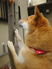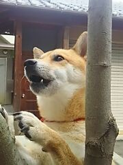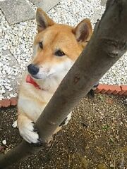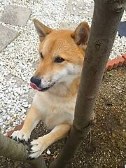 木の陰に隠れながら、こっそり覗き見している柴犬さくら。