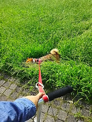 キックボードの伴走より、草叢で好きなものを発見&探検心の方が優先ですね! さくらさん。