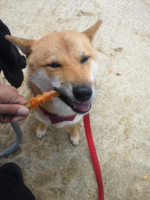 柴犬さくらは、ブースでもらったササミ巻きガム。