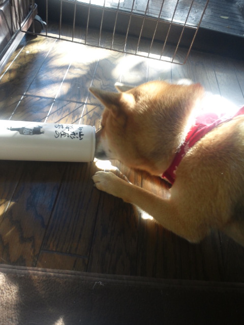 立てて置いてみると、ちょっと悩んで、諦めちゃう柴犬さくら。