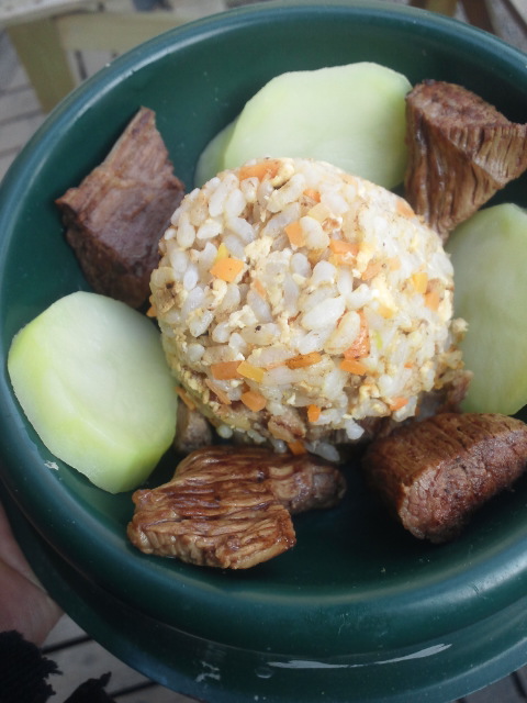 牛ステーキ(脂身無し)、牛肉と人参のチャーハン、ジャガイモです。